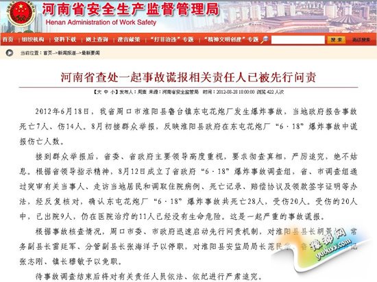《淮阳烟花厂爆炸案死亡28人瞒报21人 县长被停职》由河南新闻网-豫都网提供,转载请注明出处:http://zhoukou.yuduxx.com/huaiyang/100623.html,谢谢合作!