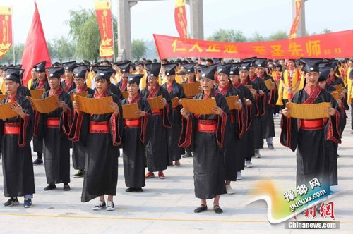 在祭拜现场,来自淮阳几所中学的学生代表向孔子塑像敬献花篮,并在主祭司的主持下,向孔子像行三拜礼(如图)。据了解,该活动是为了弘扬国学文化,培养感恩思想,加强青少年社会主义核心价值观教育,增强青少年爱国主义、民族主义自豪感而举办的。