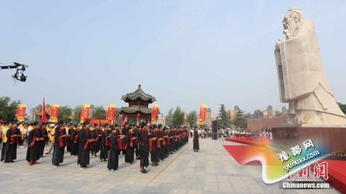 中新网讯 7月26日上午,淮阳弦歌台广场琴瑟阵阵,孔子像前人山人海。由河南省孔子学会周口分会、淮阳县弦歌台景区联合主办的“三千学子游龙湖,弦歌台前拜孔子”活动在这里启动。