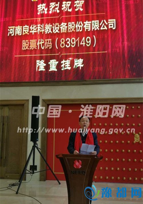 仪式上,周口市委常委、常务副市长刘保仓发表了热情洋溢的讲话,刘保仓市长强调,此次良华科教登陆资本市场,是全市中小企业进入多层次资本市场的开创性尝试,必将为公司高速发展注入新的动力和活力。希望淮阳县政府进一步提供优惠政策,希望良华科教以今天登陆资本市场为契机,走好脚下每一步,书写新的辉煌,以发展成绩感谢和回报大家。河南良华科教设备股份有限公司董事长郭良华敲锤启动仪式。