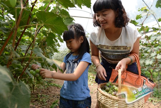 近年来,涡北镇不断加大农业产业结构调整力度,大力发展现代农业,全镇特色农业呈现出区域化种植、规模化发展的良好势头,一大批特色农业产业规模不断发展壮大。图为该镇华丰生态高效农业采摘园游客正在采摘莲子和葡萄。(闫子健摄)